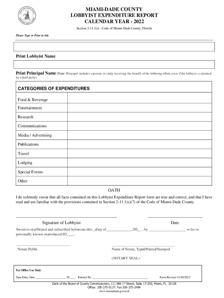 MIA MIDADE COUNTY LOBBYIST EXPENDITURE REPORT CALENDAR YEAR 2022 Section 211.1(s) Code of Miami-Dade County, Florida Please Type or Print in In-print Lobbyist Imprint Principal Name (Note: Principal