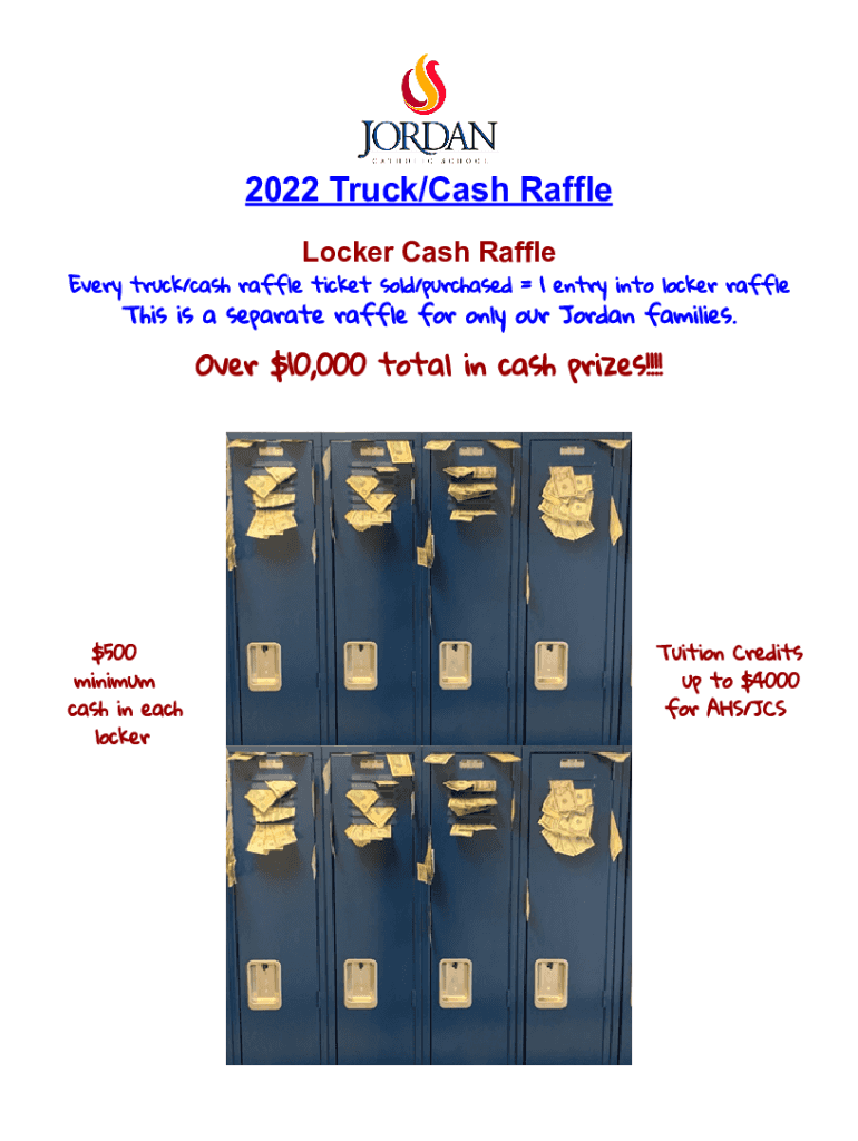 Locker Cash RaffleEvery truck/cash raffle ticket sold/purchased 1 entry into locker Raffles is a separate raffle for only our Jordan families. Over $10,000 total in cash prizes!!!!$500