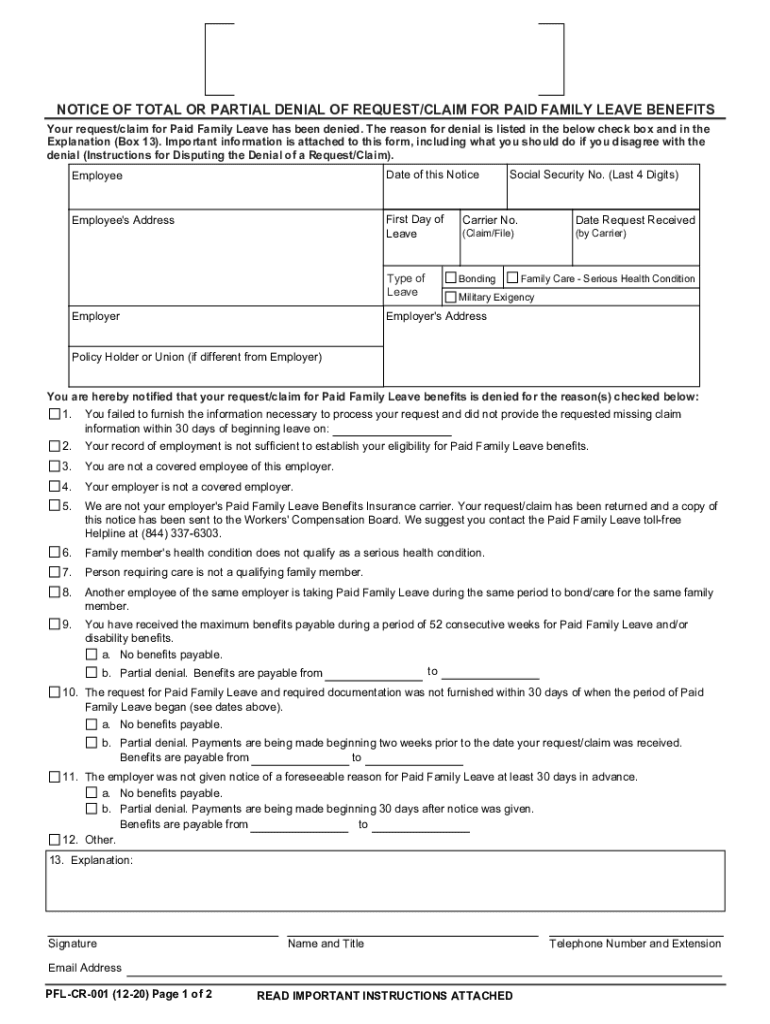 NOTICE OF TOTAL OR PARTIAL DENIAL OF REQUEST/CLAIM FOR PAID FAMILY LEAVE BENEFITS Your request/claim for Paid Family Leave has been denied. The reason for denial is listed in the below check box and