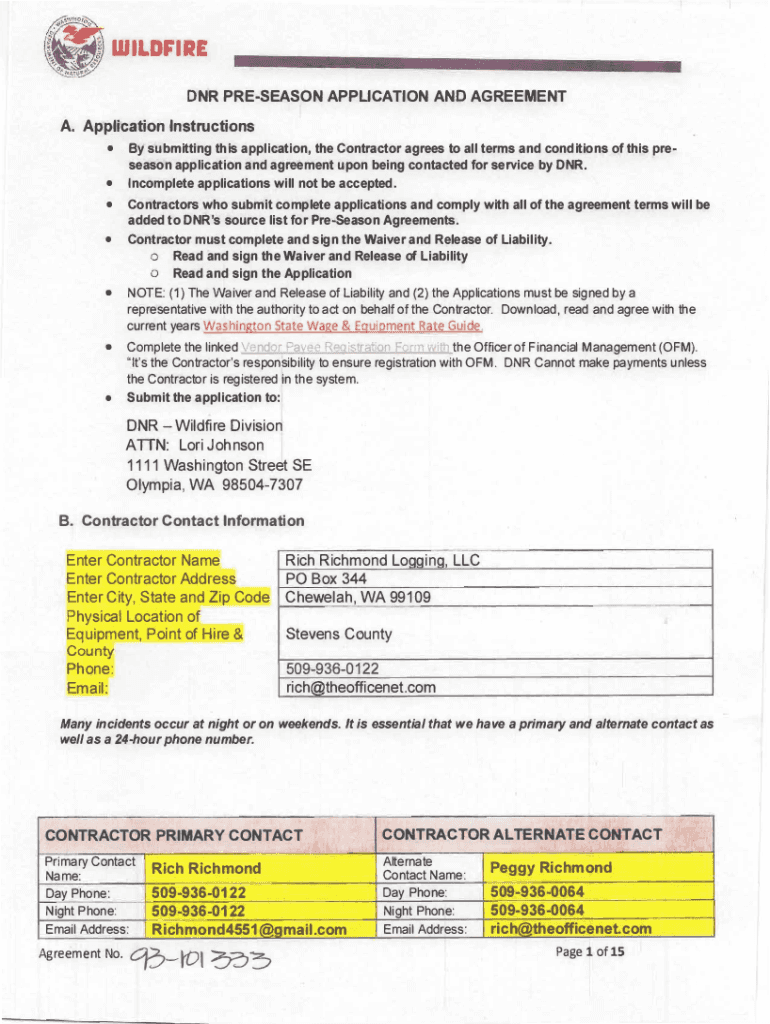 WILDFIRE DNR PRESEASON APPLICATION AND AGREEMENT. Application Instructions. By submitting this application, the Contractor agrees to all terms and conditions of this preseason application and agreement