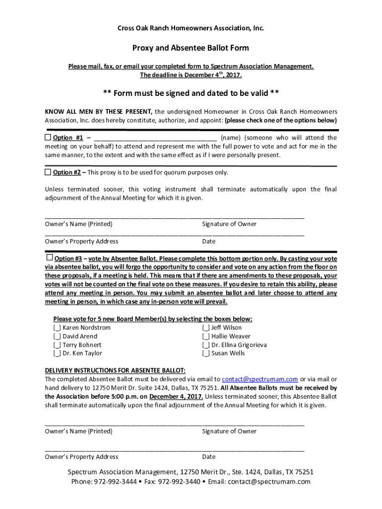 Cross Oak Ranch Homeowners Association, Inc. Proxy and Absentee Ballot Form Please mail, fax, or email your completed form to Spectrum Association Management. The deadline is December 4th, 2017.**