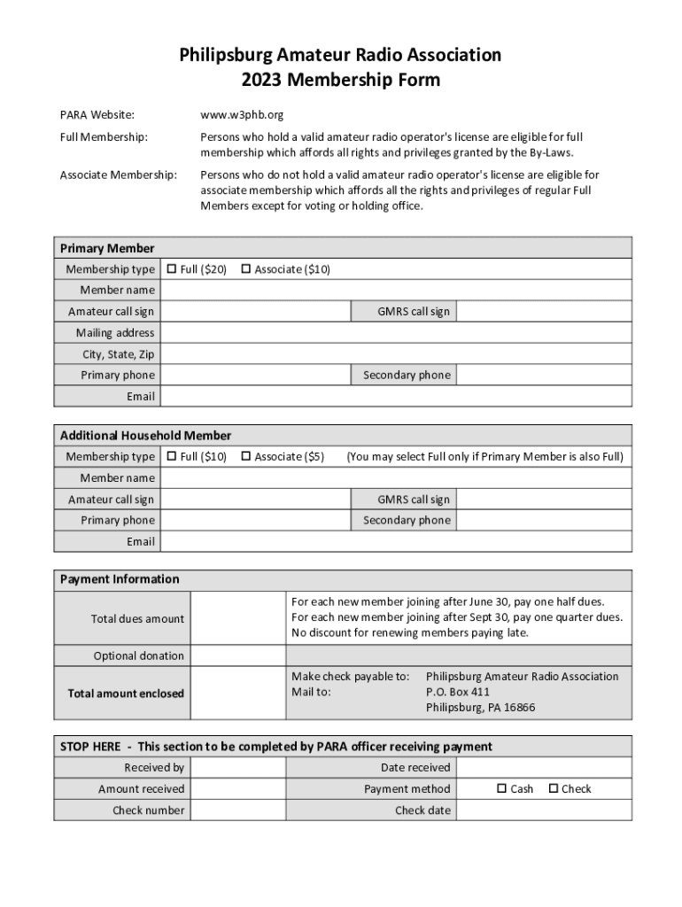 Philipsburg Amateur Radio Association 2023 Membership Form PARA Website:www.w3phb.orgFull Membership:Persons who hold a valid amateur radio operator\'s license are eligible for full membership which