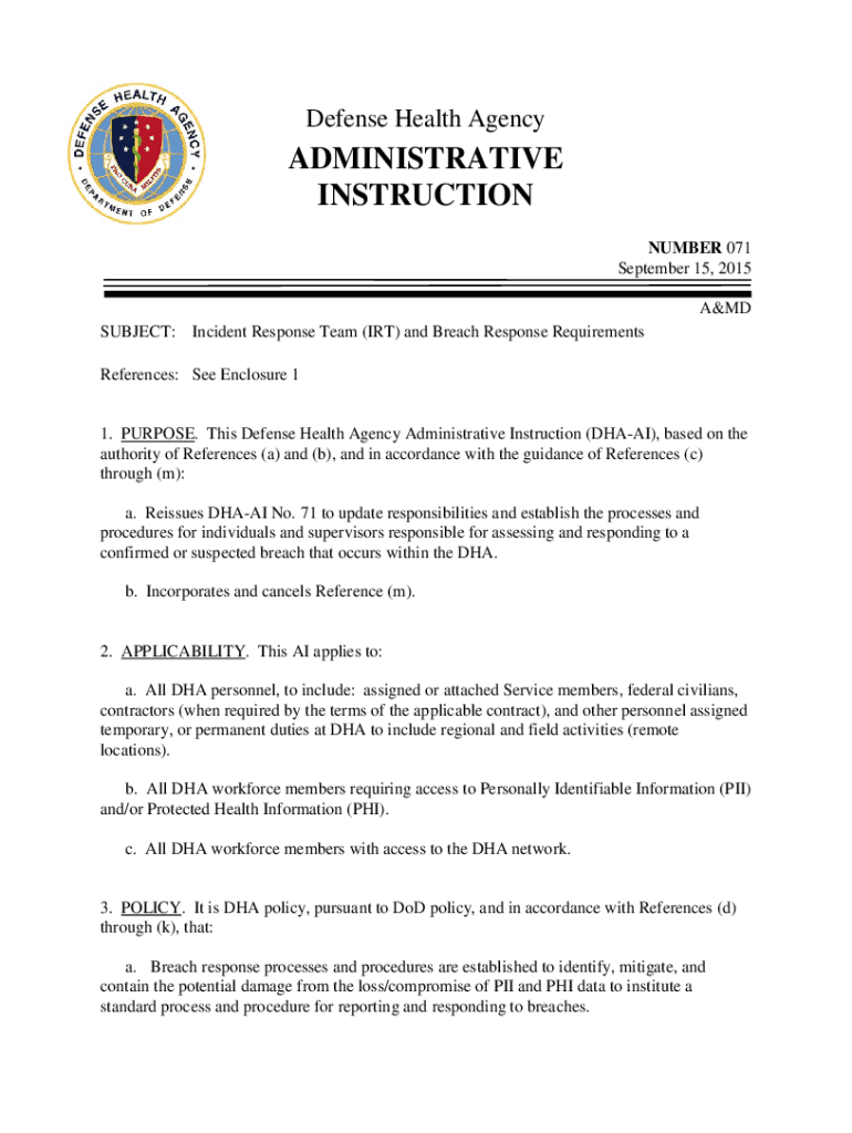 SUBJECT:Incident Response Team (IRT) and Breach Response RequirementsReferences: See Enclosure 11. PURPOSE. This