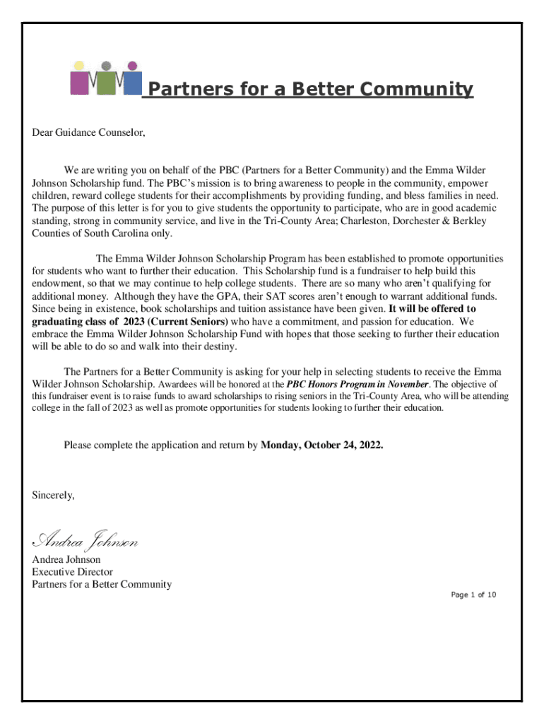 Partners for a Better Community Dear Guidance Counselor, We are writing you on behalf of the PBC (Partners for a Better Community) and the Emma Wilder Johnson Scholarship fund. The PCs mission is