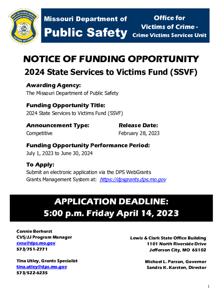 Missouri Department public SafetyOffice for Victims of Crime Victims Services Unnoticed OF FUNDING OPPORTUNITY 2024 State Services to Victims Fund (SSDF) Awarding Agency: The Missouri Department of