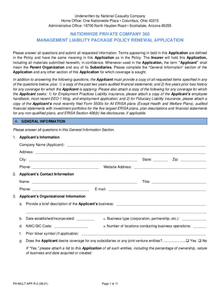 Get the free NATIONWIDE PRIVATE COMPANY 360 MANAGEMENT LIABILITY PACKAGE POLICY RENEWAL APPLICATION