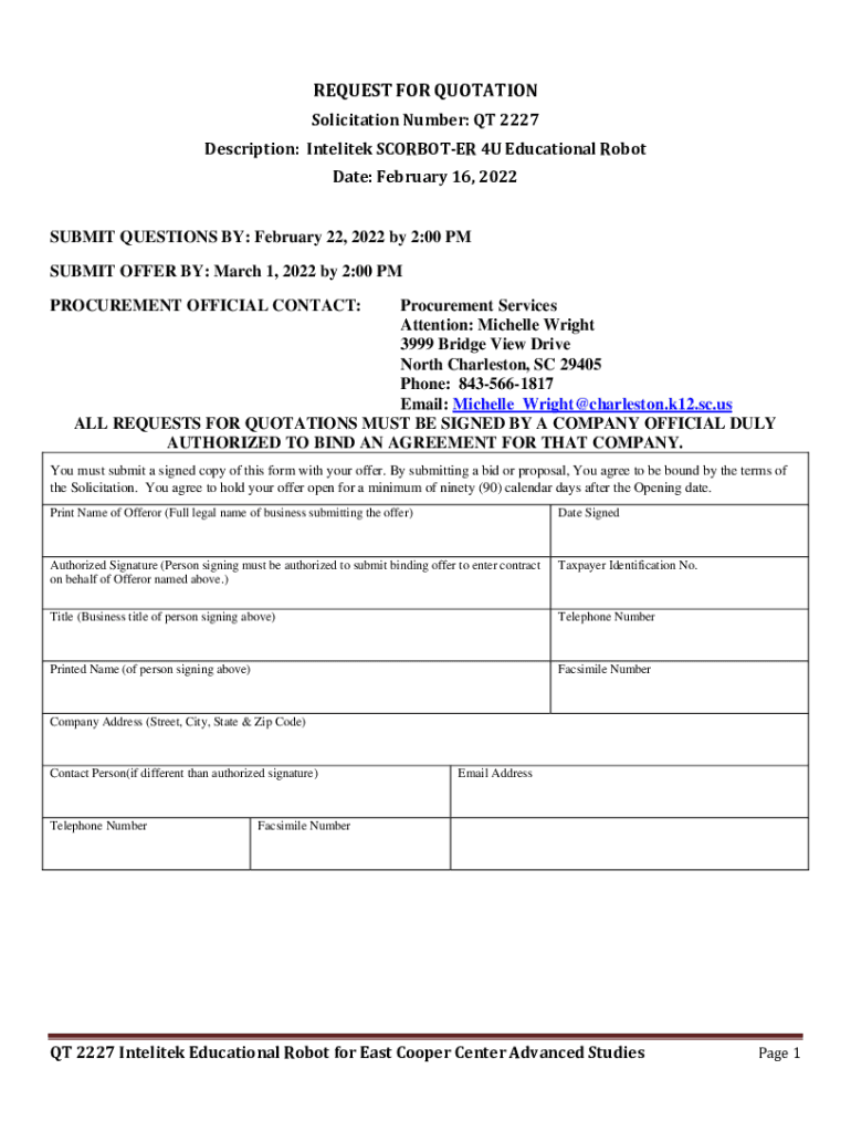 REQUEST FOR QUOTATION Solicitation Number: QT 2227 Description: Inherited SCOOTER 4U Educational Robot Date: February 16, 2022, SUBMIT QUESTIONS BY: February 22, 2022, by 2:00 PM SUBMIT OFFER BY: