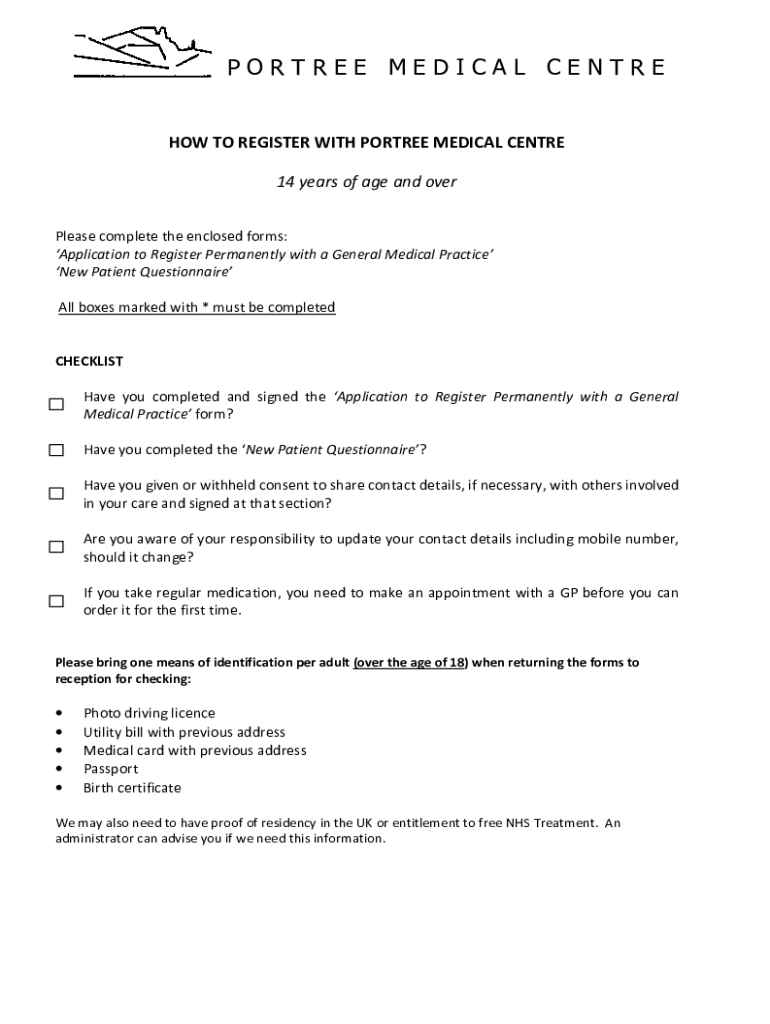 PORTER MEDICAL ENTREPÔT TO REGISTER WITH PORTER MEDICAL Center 14 years of age and over Please complete the enclosed forms: Application to Register Permanently with a General Medical Practice New