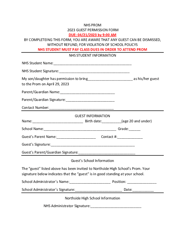 NHS PROM 2023 GUEST PERMISSION FORM DUE: 04/21/2023 by 9:00 AM BY COMPLETING THIS FORM, YOU ARE AWARE THAT ANY GUEST CAN BE DISMISSED, WITHOUT REFUND, FOR VIOLATION OF SCHOOL POLICY NHS STUDENT MUST