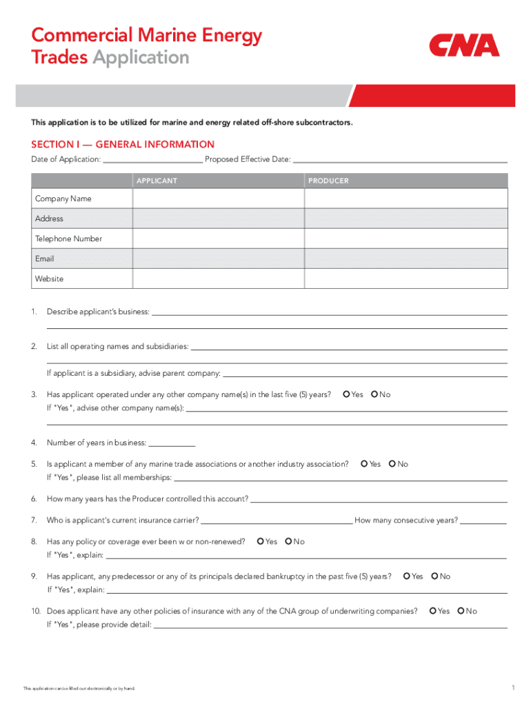 Commercial Marine Energy Trades Applications application is to be utilized for marine and energy related offshore subcontractors. SECTION I GENERAL INFORMATION Date of Application:Proposed Effective