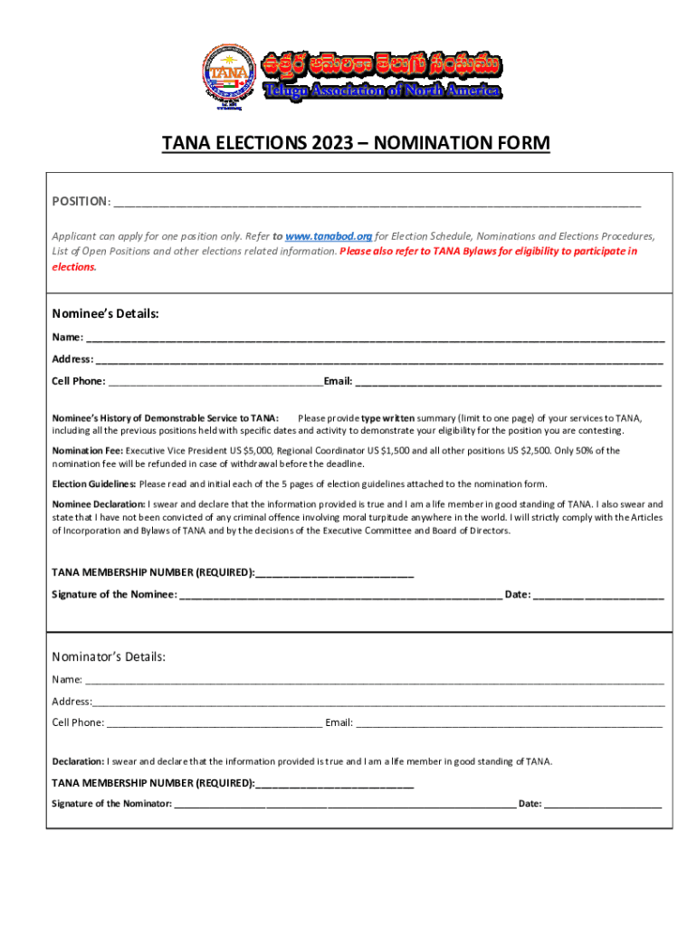 Get the free NOMINATION FORM - TANA ELECTIONS 2023