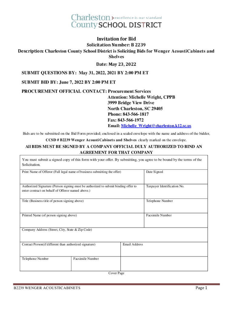 Invitation for Solicitation Number: B 2239 Description: Charleston County School District is Soliciting Bids for Winger AcoustiCabinets and Shelves Date: May 23, 2022, SUBMIT QUESTIONS BY: May 31,