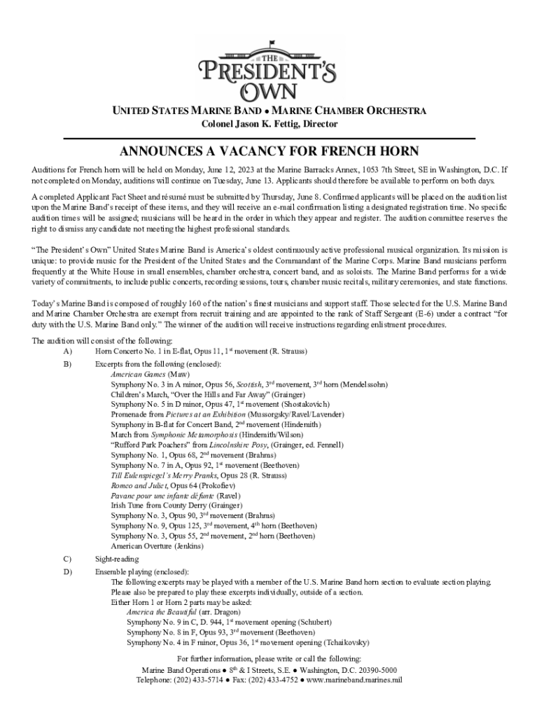 UNITED STATES MARINE BAND MARINE CHAMBER ORCHESTRA Colonel Jason K. Rettig, DirectorANNOUNCES A VACANCY FOR FRENCH HORN Auditions for French horn will be held on Monday, June 12, 2023, at the Marine
