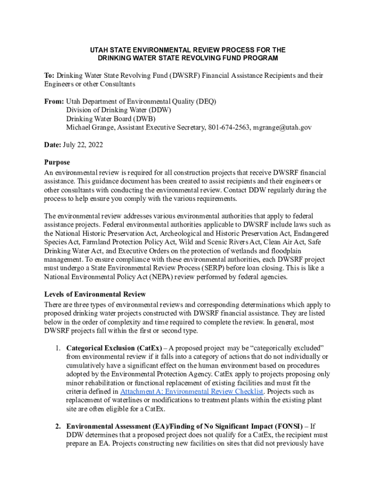 UTAH STATE ENVIRONMENTAL REVIEW PROCESS FOR THE DRINKING WATER STATE REVOLVING FUND Program: Drinking Water State Revolving Fund (DWARF) Financial Assistance Recipients and their Engineers or other