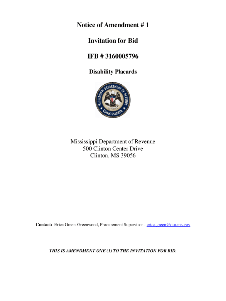 Notice of Amendment # 1 Invitation for Bid IF # 3160005796 Disability Placards Mississippi Department of Revenue 500 Clinton Center Drive Clinton, MS 39056Contact: Erica GreenGreenwood, Procurement