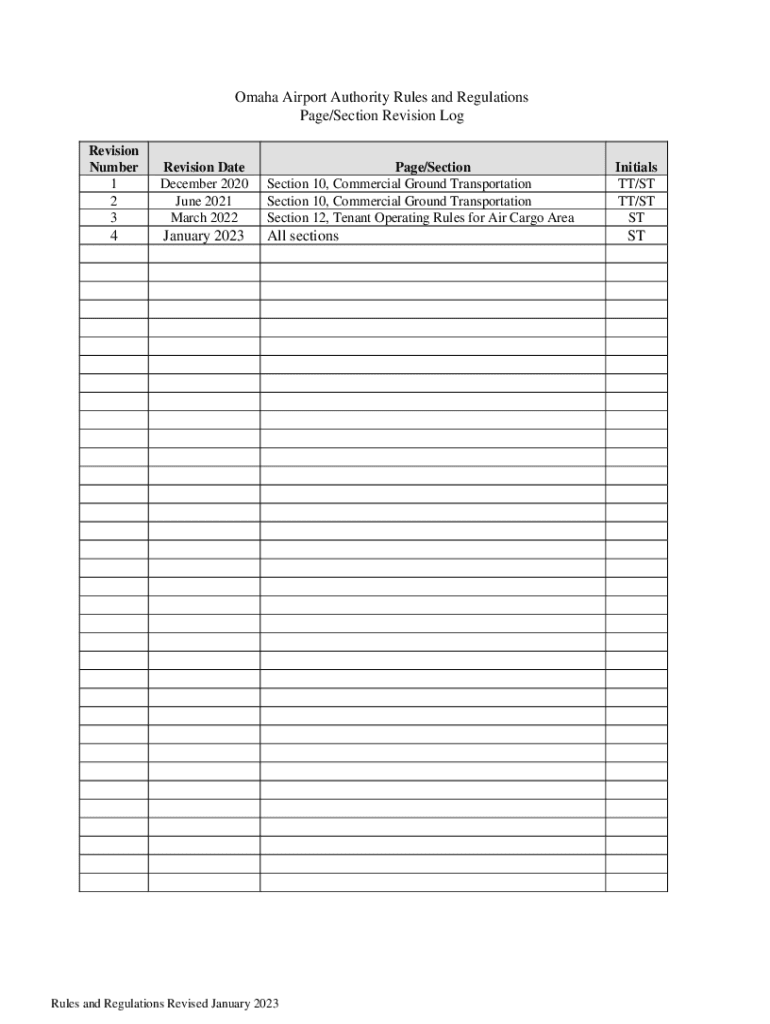 OMAHA AIRPORT AUTHORITY RULES AND REGULATIONSREVISED January 2023TABLE OF CONTENTS SECTIONDESCRIPTION1.0Definitions2.0Introduction 2.1 Authority for Implementation of Rules and Regulations 2.2 Applicability