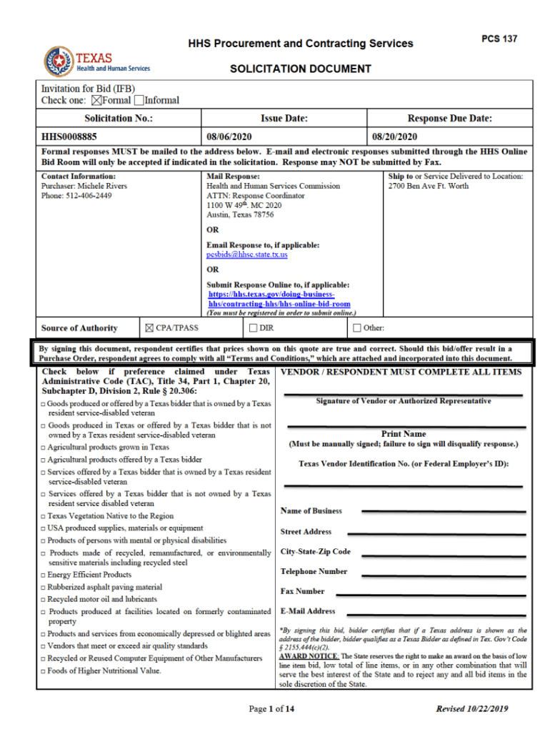 HHS Procurement and Contracting Services PCS 137SOLICITATION NUMBER HHS0008885 1. INTRODUCTION AND PURPOSE OF SOLICITATION The Health and Human Services Commission (HHSC) Procurement and Contracting