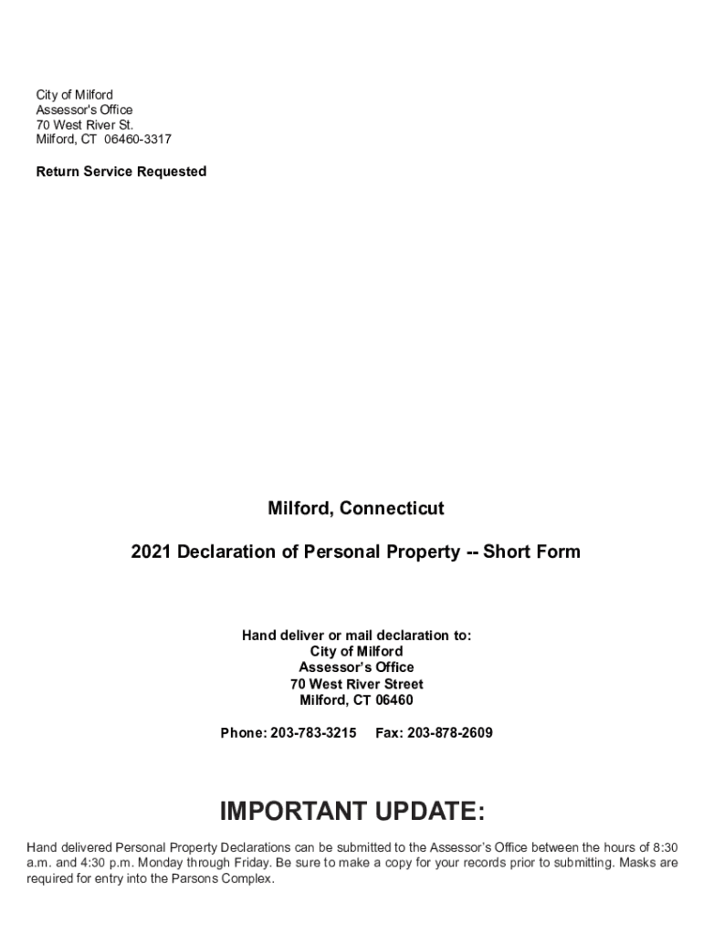 City of Milford Assessor\'s Office 70 West River St. Milford, CT 064603317Return Service Requested City of Milford Assessor\'s Office 70 West River St. Milford, CT 064603317Return Service Requested