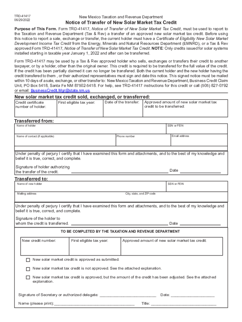 TRD41417 06/29/2022New Mexico Taxation and Revenue DepartmentNotice of Transfer of New Solar Market Tax CreditPurpose of This Form. Form TRD41417, Notice of Transfer of New Solar Market Tax Credit,