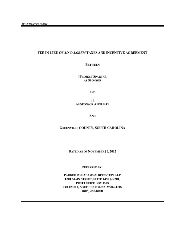 PPB DRAFT 09.19.2012FEEINLIEU OF AD VALOR EM TAXES AND INCENTIVE AGREEMENTBETWEEN[PROJECT SPARTA], AS SPONSOR AND[ ], AS SPONSOR AFFILIATEANDGREENVILLE COUNTY, SOUTH CAROLINADATED AS OF NOVEMBER [