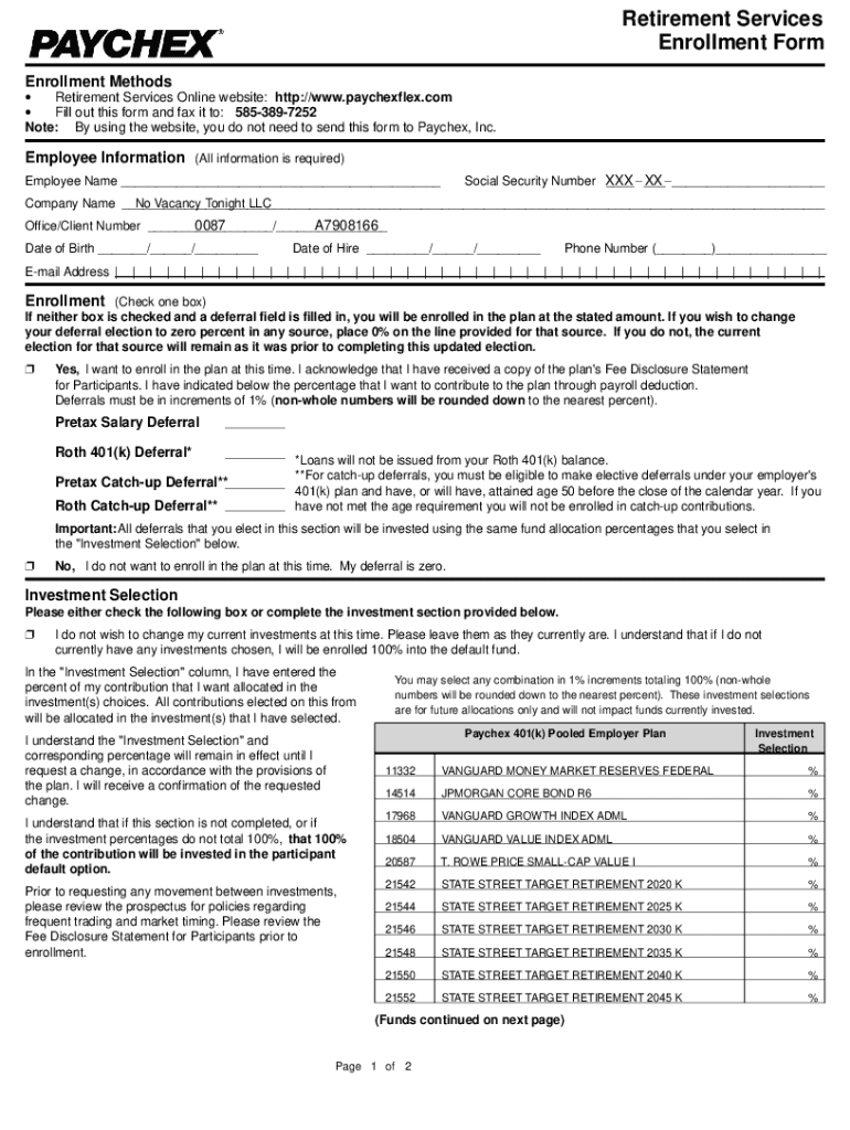 Retirement Services Enrollment Form Enrollment Methods Retirement Services Online website: http://www.paychexflex.com Fill out this form and fax it to: 5853897252 Note: By using the website, you do