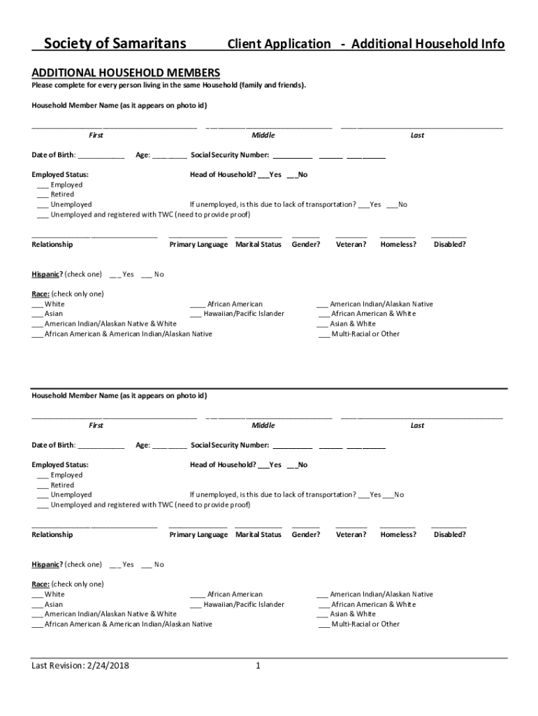 Society of SamaritansClient Application Additional Household InfoADDITIONAL HOUSEHOLD MEMBERS Please complete for every person living in the same Household (family and friends). Household Member Name