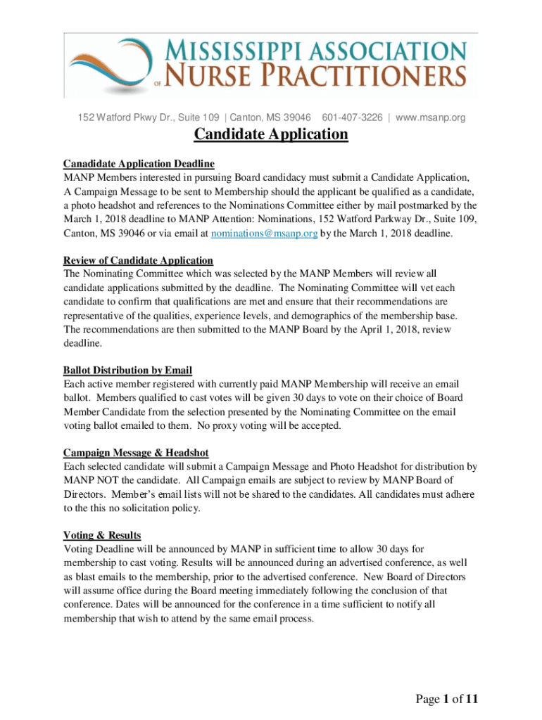 152 Watford Pkwy Dr., Suite 109 | Canton, MS 390466014073226 | www.msanp.orgCandidate Application Candidate Application Deadline MANY Members interested in pursuing Board candidacy must submit a Candidate