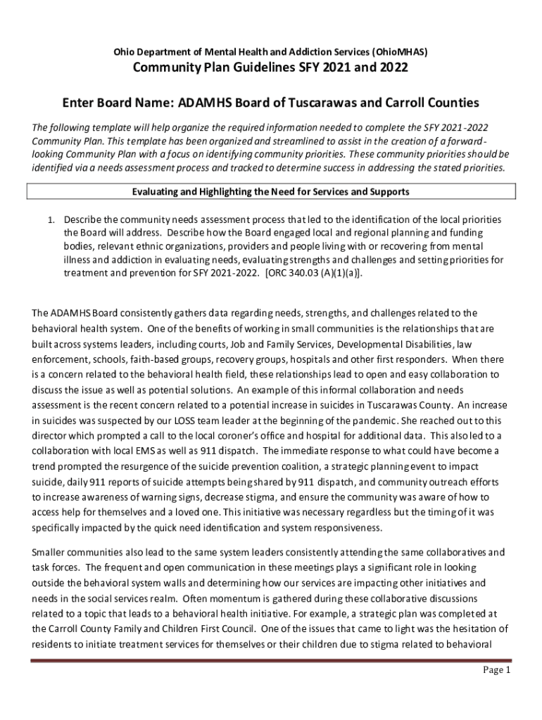 Ohio Department of Mental Health and Addiction Services (Thomas)Community Plan Guidelines SAY 2021 and 2022 Enter Board Name: ADAMS Board of Tuscaroras and Carroll Counties The following template