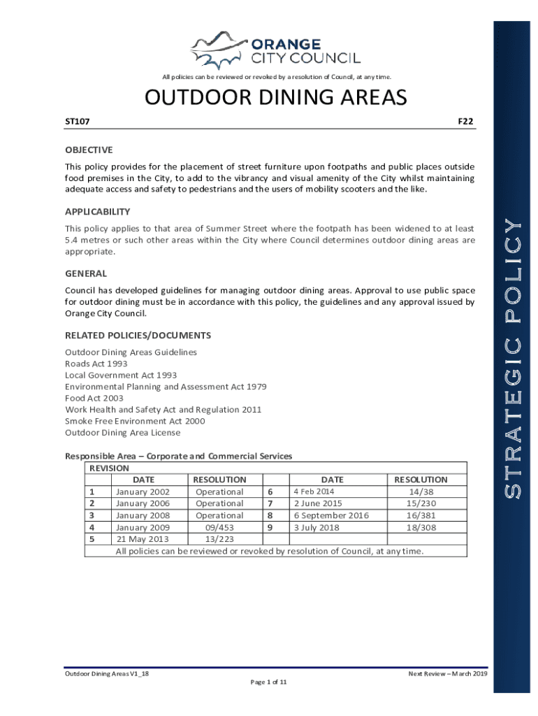 All policies can be reviewed or revoked by a resolution of Council, at any time. OUTDOOR DINING AREAS ST107F22OBJECTIVE This policy provides for the placement of street furniture upon footpaths and