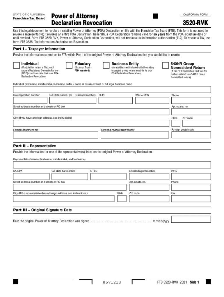 STATE O F C A L I F O R N I Franchise Tax Borrower of Attorney Declaration RevocationCALIFORNIA FORM3520RVKUse this legal document to revoke an existing Power of Attorney (POA) Declaration on file