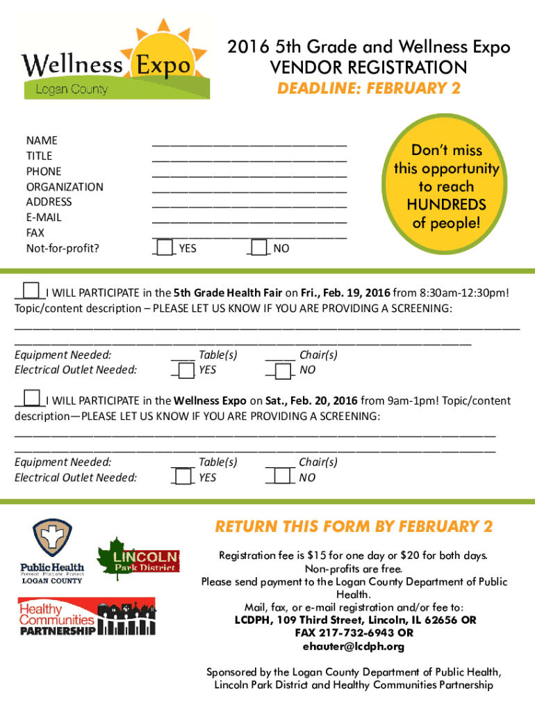 2016 5th Grade and Wellness Expo VENDOR REGISTRATION DEADLINE: FEBRUARY 2 NAME TITLE PHONE ORGANIZATION ADDRESS EMAIL FAX Notforprofit? ___ ___ ___ ___ ___ ___ ___ ___YES ___Noon miss this opportunity