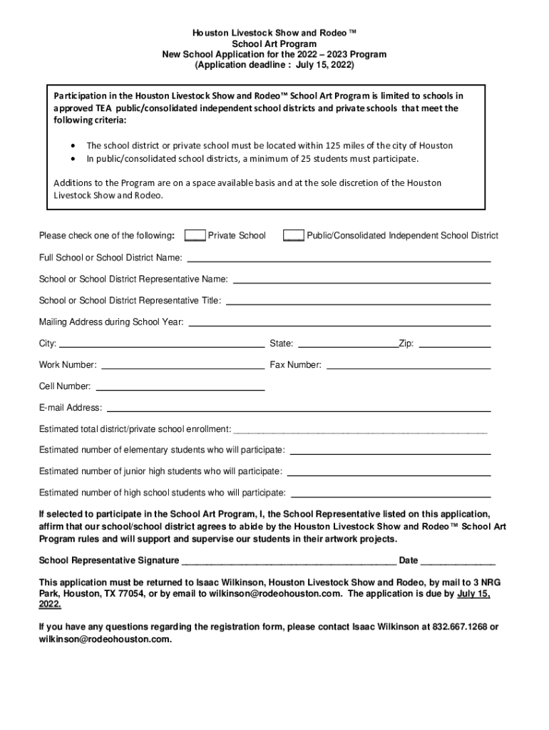 Houston Livestock Show and Rodeo School Art Program New School Application for the 2022 2023 Program (Application deadline : July 15, 2022)Participation in the Houston Livestock Show and Rodeo School