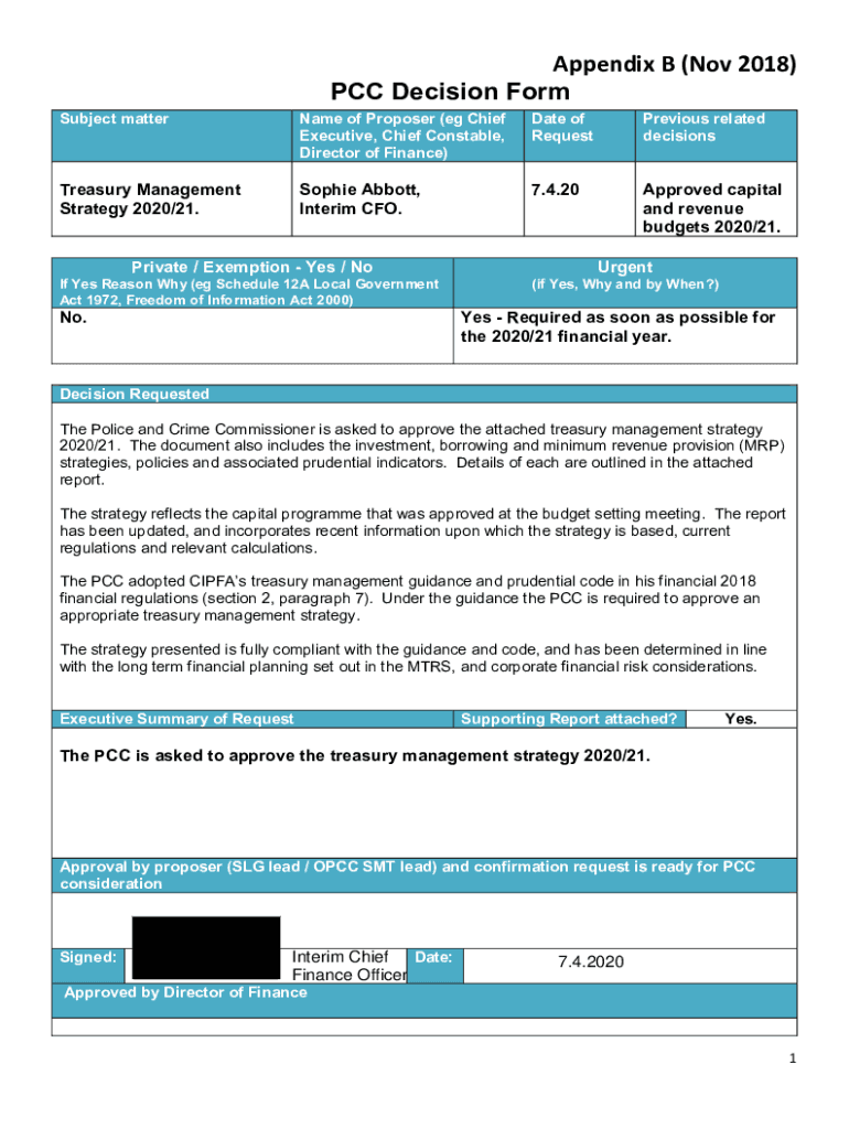 Appendix B (Nov 2018) PCC Decision Form Subject alternate of Proposer (e.g. Chief Executive, Chief Constable, Director of Finance)Date of RequestPrevious related decisions Treasury Management Strategy