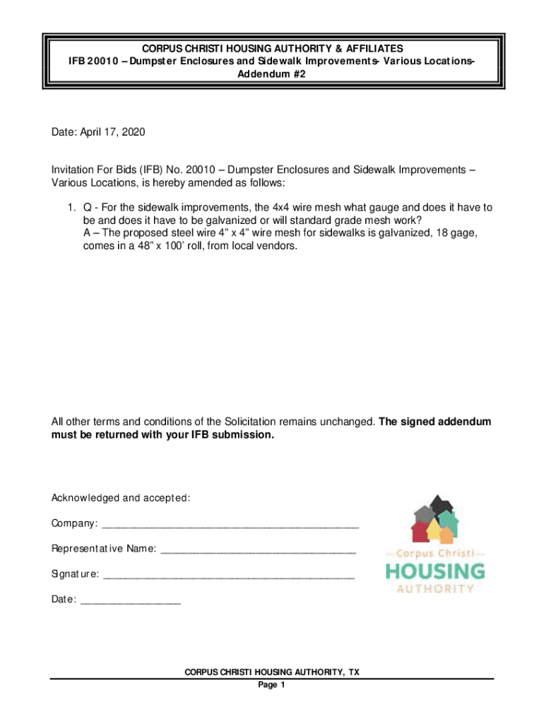 CORPUS CHRISTI HOUSING AUTHORITY & AFFILIATES IF 20010 Dumpster Enclosures and Sidewalk Improvements Various LocationsAddendum #2Date: April 17, 2020Invitation For Bids (IF) No. 20010 Dumpster Enclosures