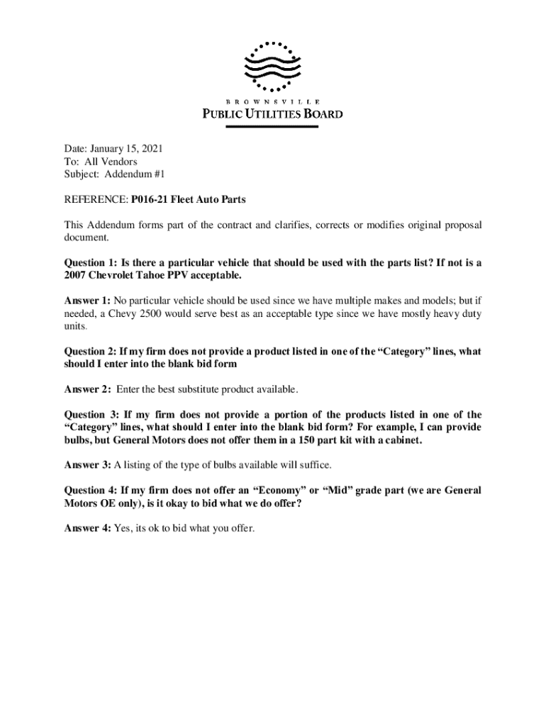 Date: January 15, 2021, To: All Vendors Subject: Addendum #1 REFERENCE: P01621 Fleet Auto Parts This Addendum forms part of the contract and clarifies, corrects or modifies original proposal document.