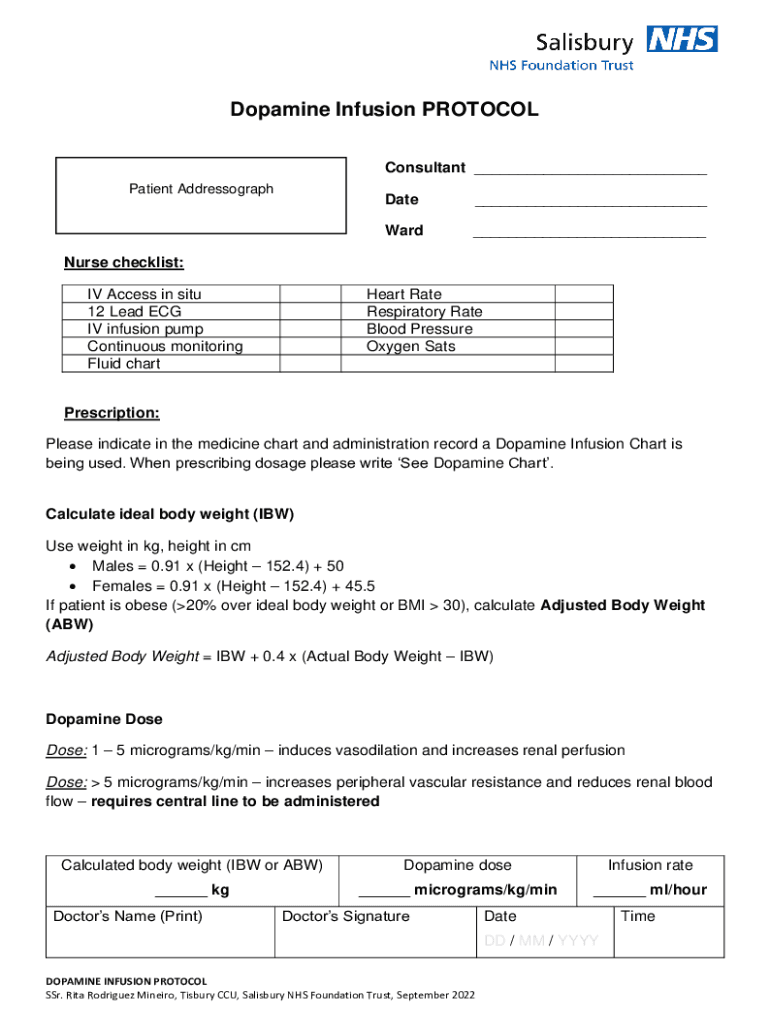 Infusion PROTOCOL Consultant ___ Patient AddressographDate___Ward___Nurse checklist: IV Access in situ 12 Lead ECG IV infusion pump Continuous monitoring Fluid chartered Rate Respiratory Rate Blood