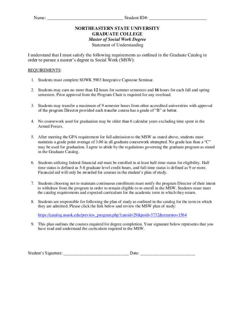 Name: ___ Student ID#: ___ NORTHEASTERN STATE UNIVERSITY GRADUATE COLLEGE Master of Social Work Degree Statement of Understanding I understand that I must satisfy the following requirements as outlined