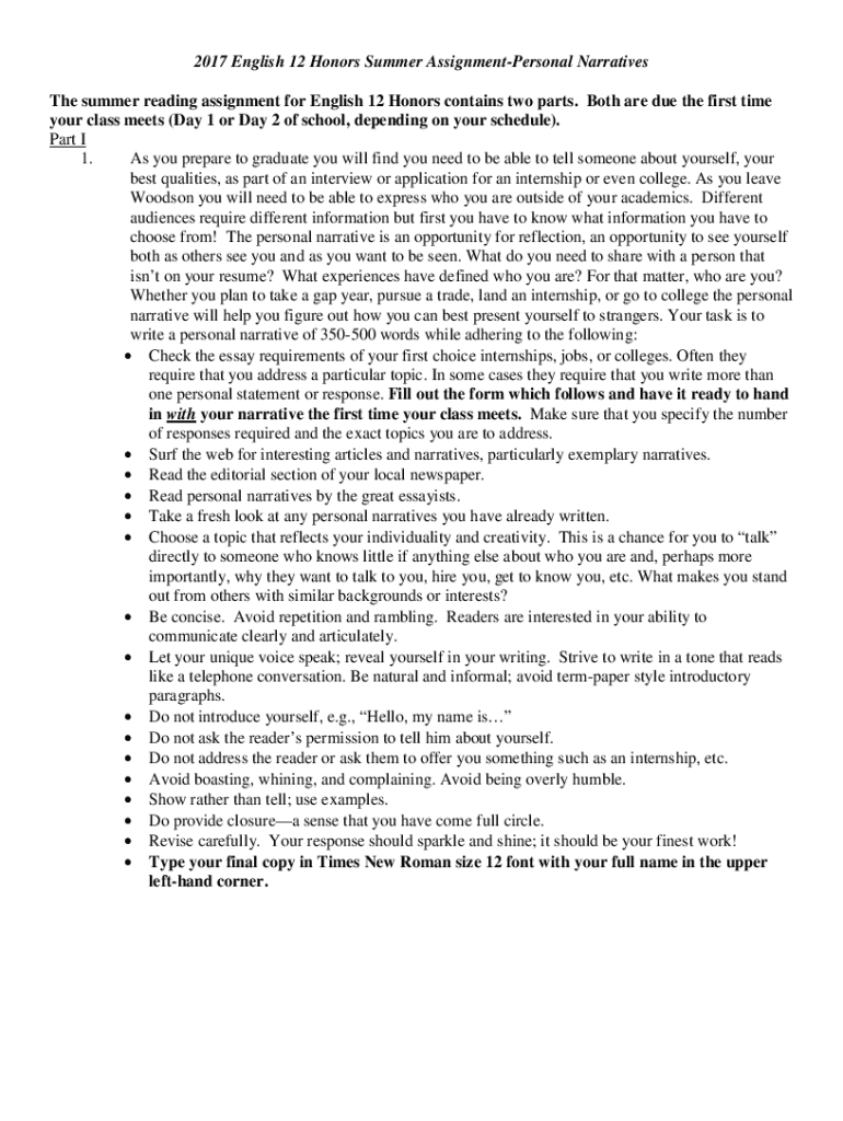 2017 English 12 Honors Summer AssignmentPersonal Narratives The summer reading assignment for English 12 Honors contains two parts. Both are due the first time your class meets (Day 1 or Day 2 of