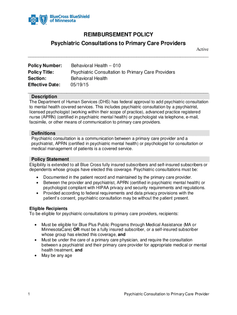 REIMBURSEMENT POLICY Psychiatric Consultations to Primary Care Providers Active ___ Policy Number: Behavioral Health 010 Policy Title: Psychiatric Consultation to Primary Care Providers Section: Behavioral