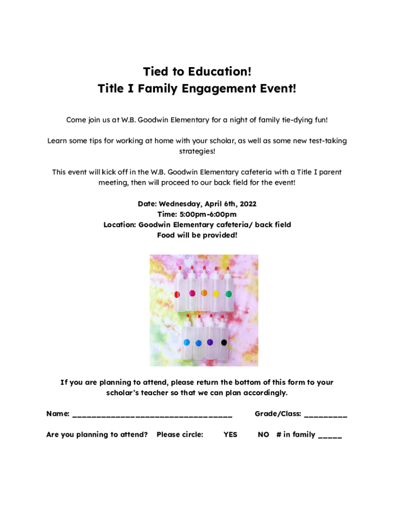 Tied to Education! Title I Family Engagement Event! Come join us at W.B. Goodwin Elementary for a night of family tidying fun! Learn some tips for working at home with your scholar, as well as some