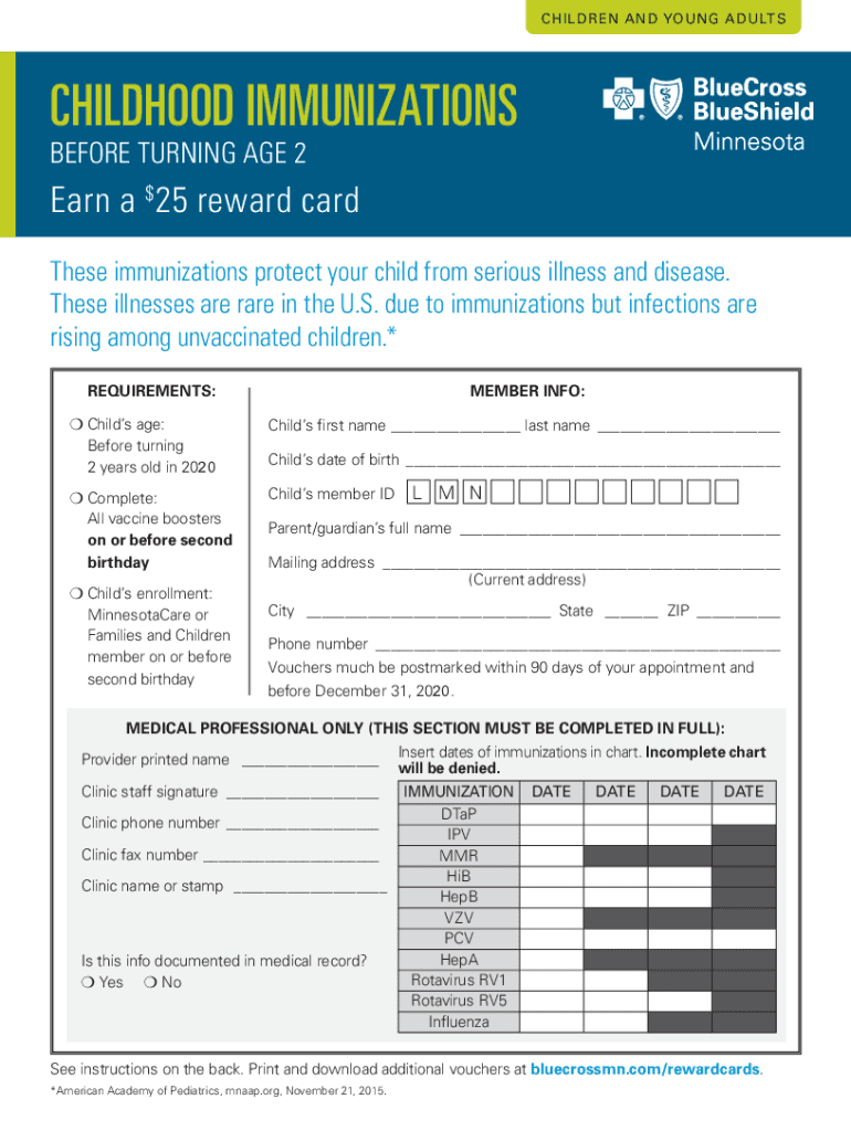 CHILDREN AND YOUNG ADULTSCHILDHOOD IMMUNIZATIONS BEFORE TURNING AGE 2Earn a $25 reward card These immunizations protect your child from serious illness and disease. These illnesses are rare in the