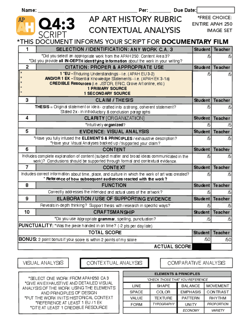 Name: ___ Per: ___ Due Date: May 18, 2017 *FREE CHOICE: ENTIRE APA 250 IMAGE SETQ4:3 Q4:2 SCRIP TAP ART HISTORY RUBRIC CONTEXTUAL ANALYSIS×THIS DOCUMENT INFORMS YOUR SCRIPT FOR DOCUMENTARY FILM 1SELECTION