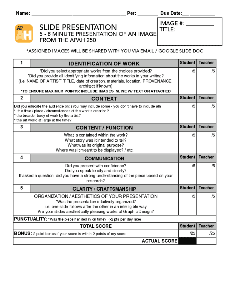 Name: ___ Per: ___ Due Date:___SLIDE PRESENTATION5 8 MINUTE PRESENTATION OF AN IMAGE FROM THE APA 250IMAGE #: ___ TITLE:*ASSIGNED IMAGES WILL BE SHARED WITH YOU VIA EMAIL / GOOGLE SLIDE DOC 1Student