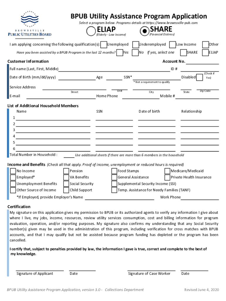 PUB Utility Assistance Program Application Select a program below. Program details at https://www.brownsvillepub.comSHARE (Financial Distress)ELIAS (Elderly Low Income)I am applying concerning the