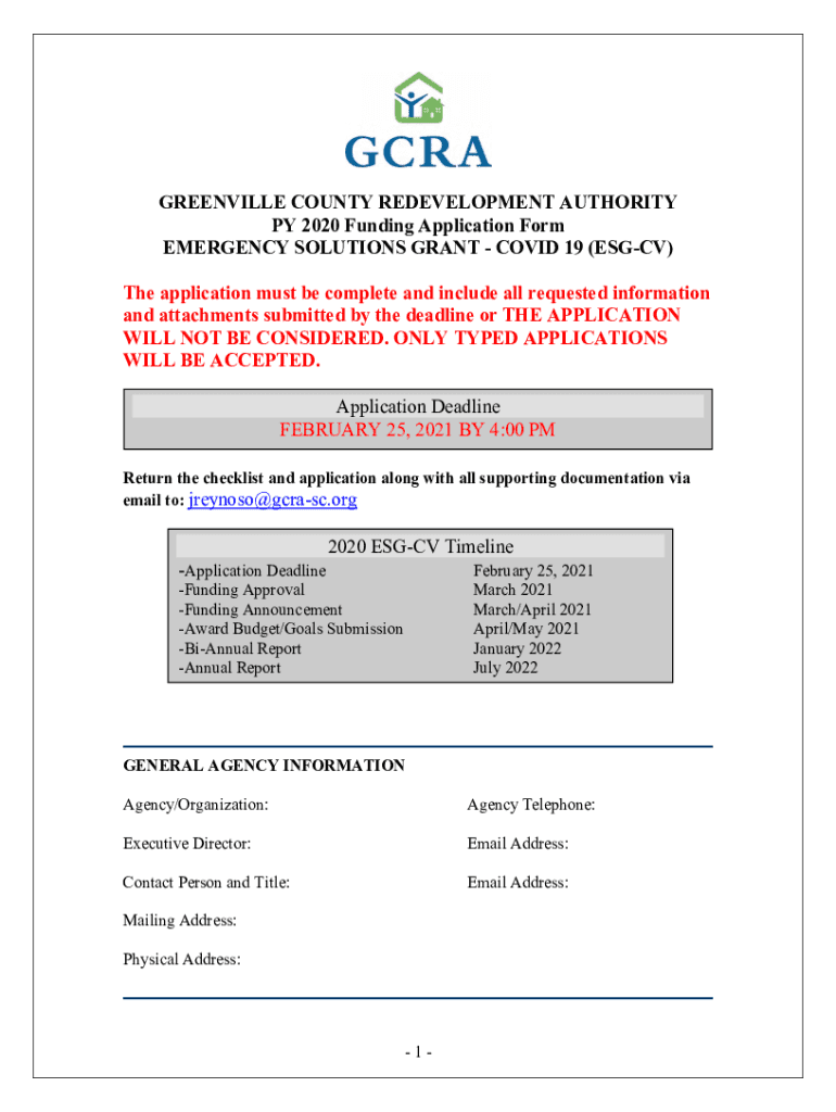 GREENVILLE COUNTY REDEVELOPMENT AUTHORITY BY 2020 Funding Application Form EMERGENCY SOLUTIONS GRANT COVID-19 (ESG CV) The application must be complete and include all requested information and attachments