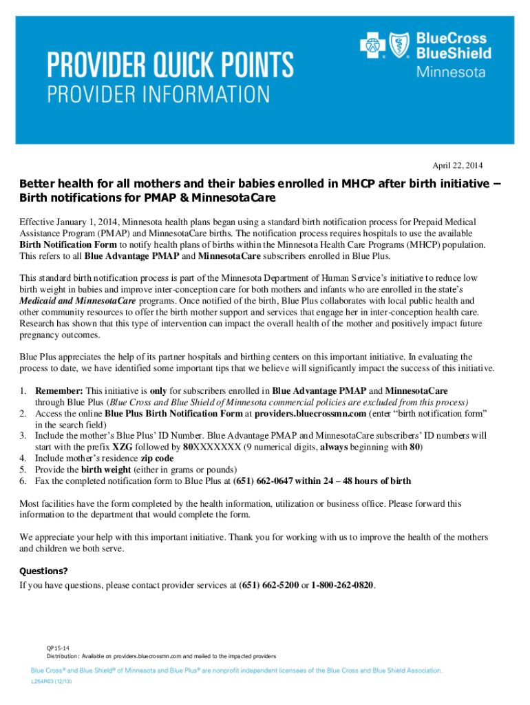 April 22, 2014Better health for all mothers and their babies enrolled in MCP after birth initiative Birth notifications for MAP & MinnesotaCare Effective January 1, 2014, Minnesota health plans began