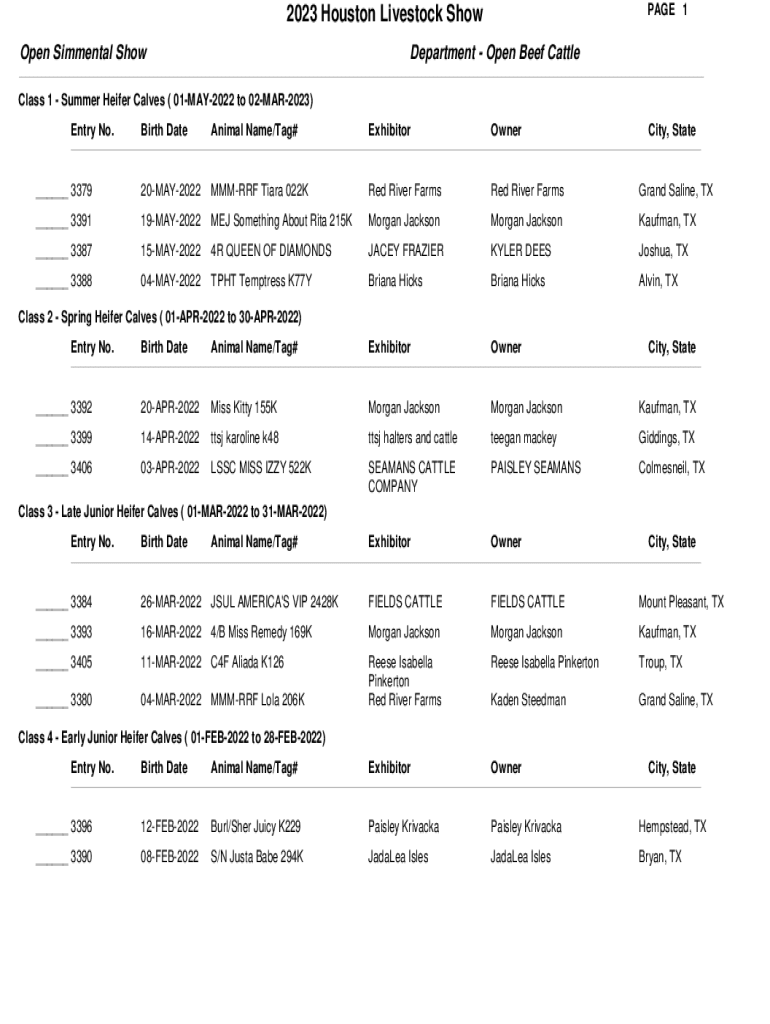 PAGE 12023 Houston Livestock Show Department Open Beef Cattlemen Simmental Show Class 1 Summer Heifer Calves (01MAY2022 to 02MAR2023) Entry No. Birth Satanical Name/Tag#ExhibitorOwnerCity, State___