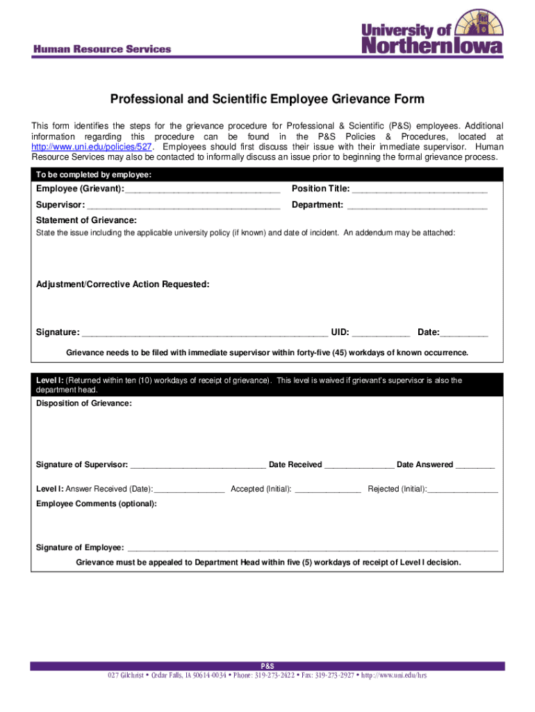 Get the free Professional and Scientific Employee Grievance Form - hrs uni
