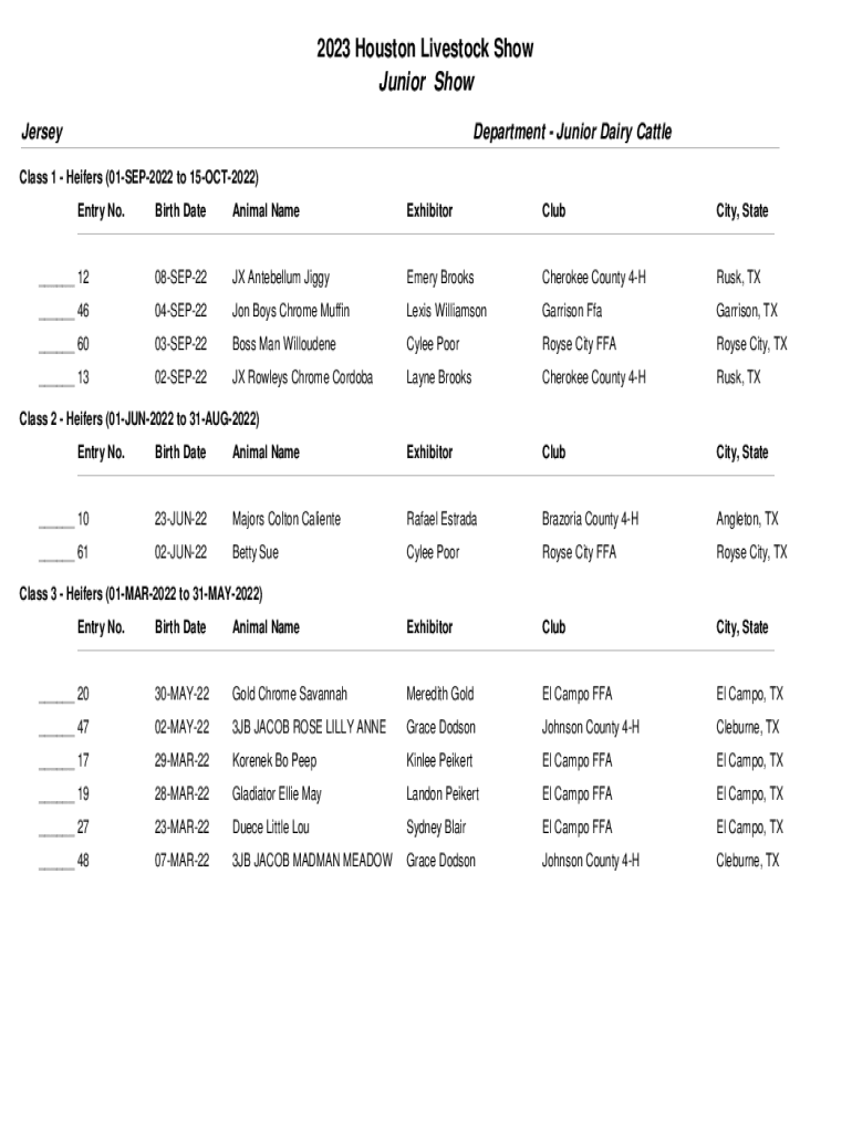 2023 Houston Livestock Show Junior Show JerseyDepartment Junior Dairy CattleClass 1 Heifers (01SEP2022 to 15OCT2022) Birth Satanical NameExhibitorClubCity, State___ 1208SEP22JX Antebellum JiggyEmery