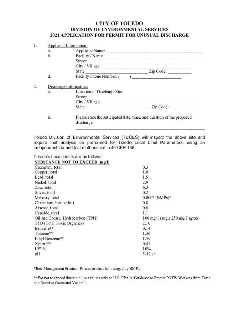 CITY OF TOLEDODIVISION OF ENVIRONMENTAL SERVICES 2021 APPLICATION FOR PERMIT FOR UNUSUAL DISCHARGE 1. Applicant Information: a. Applicant Name: ___ b. Facility / Name: ___ Street: ___ City / Village: